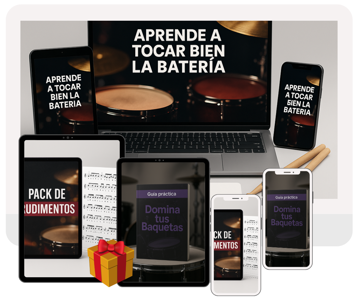 🥁 Más de 15 módulos con videos en full HD para tu aprendizaje, que te llevarán a tocar la batería como un profesional, desde cero, con un paso a paso claro